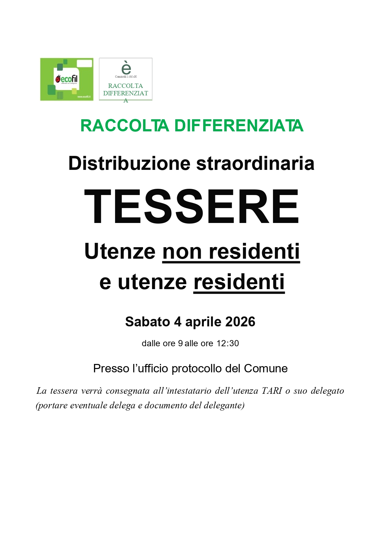 Avviso consegna straordinaria tessere raccolta differenziata utenti residenti e non residenti. Sabato 4 aprile 2026